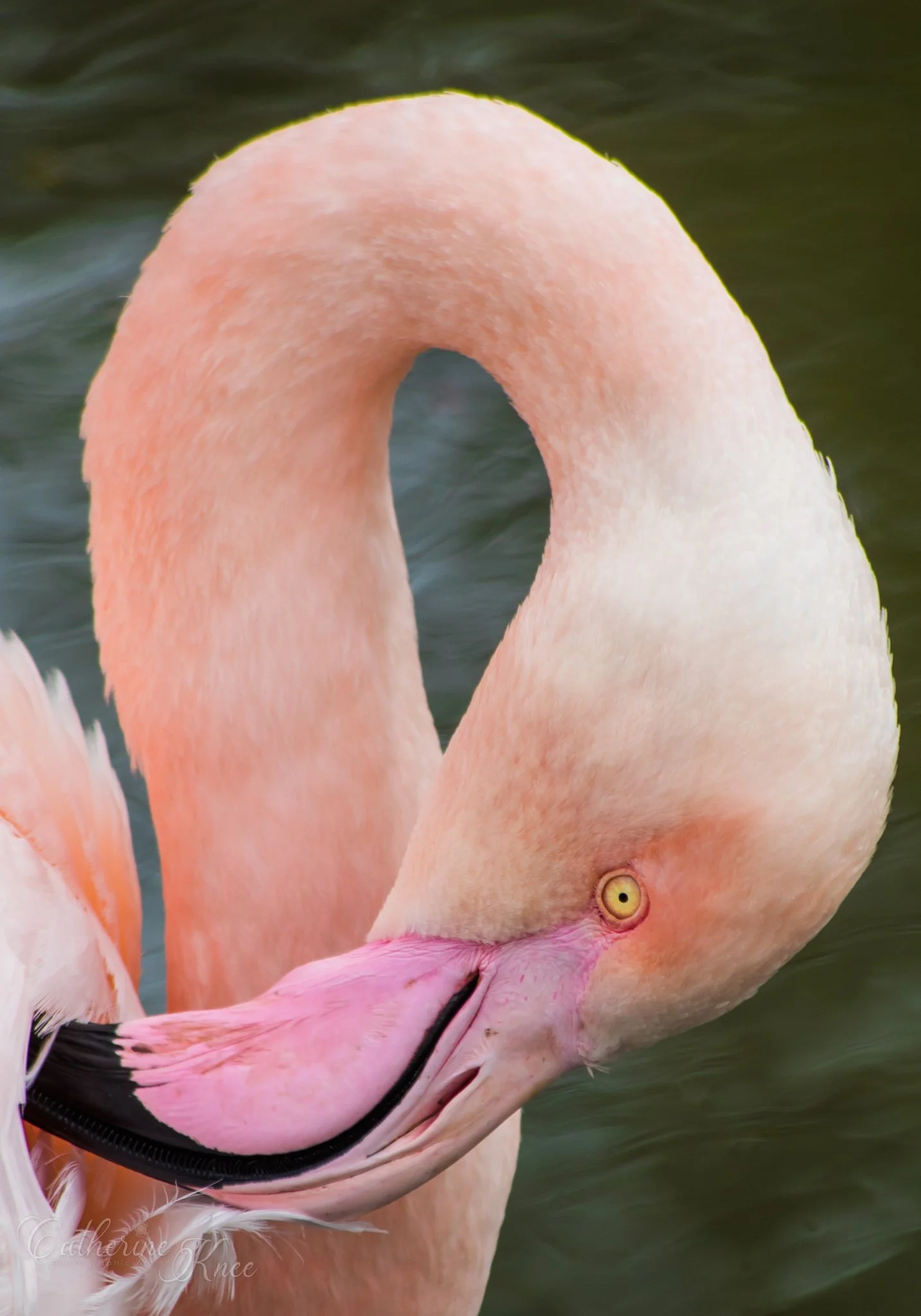 I really struggle to find a composition I am happy with on flamingo photographs, but I really liked this portrait. I find their look so unusual, and so pink goddamit!! It is almost weird that their eyes are not also pink, in a way! It feels a bit weird, I guess, with the head upside down, but I like the curve it creates in the shot.