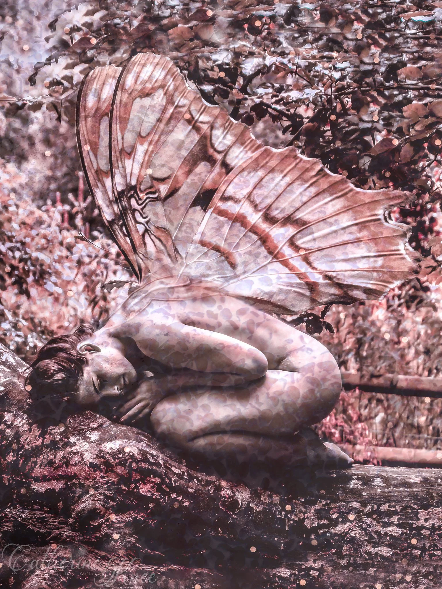 Cariad really was in this tree, nude, for me. I added butterfly wings and a textured effect over the top. I then adjusted it to a two-tone colour palette.